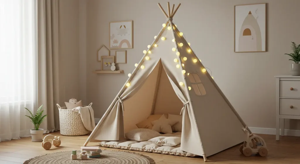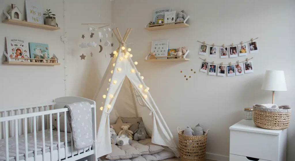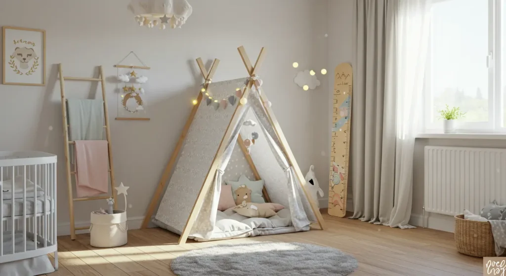 A DIY teepee tent adds a fun and cozy spot in the nursery. It creates a space for your child to play, read, or relax. You can build it to match your nursery’s style and size.