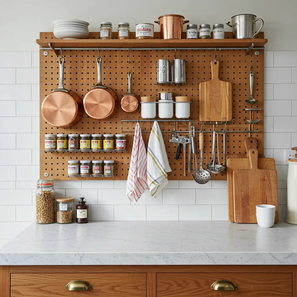 Let’s be honest – rummaging through kitchen drawers is the worst. You know that frustrating moment when you’re looking for the can opener while something’s burning on the stove? A kitchen pegboard eliminates that chaos.