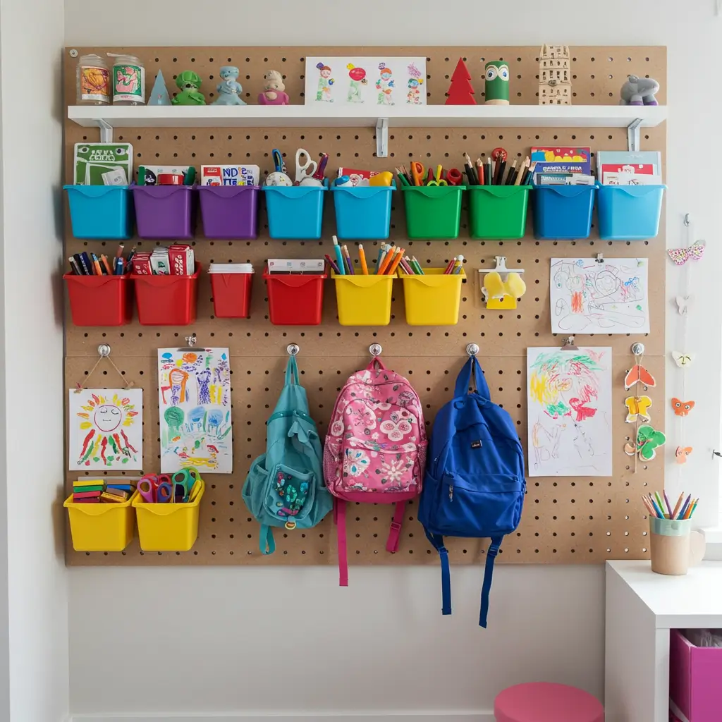 The visual nature of pegboards works perfectly with how kids think. When they can see it, they’re more likely to use it (and put it back).