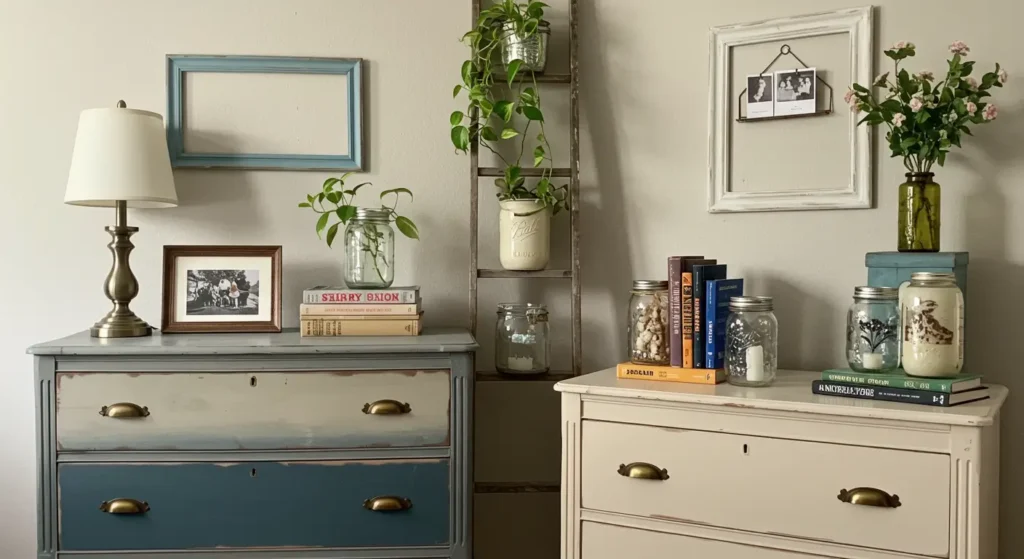 Get creative with upcycling. Turn old picture frames into cool wall organizers or use old ladders as shelves. Glass jars and bottles can become vases, candle holders, or storage. The world of upcycling is full of possibilities.