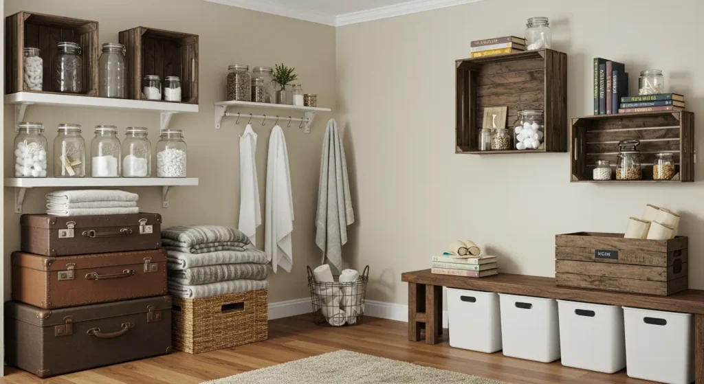 Organizing your home doesn’t have to be expensive. With a bit of imagination, you can create stylish, space-saving storage using affordable and even repurposed items. Think mason jars for bathroom essentials, vintage suitcases for blanket storage, or wooden wine crates transformed into rustic shelves.