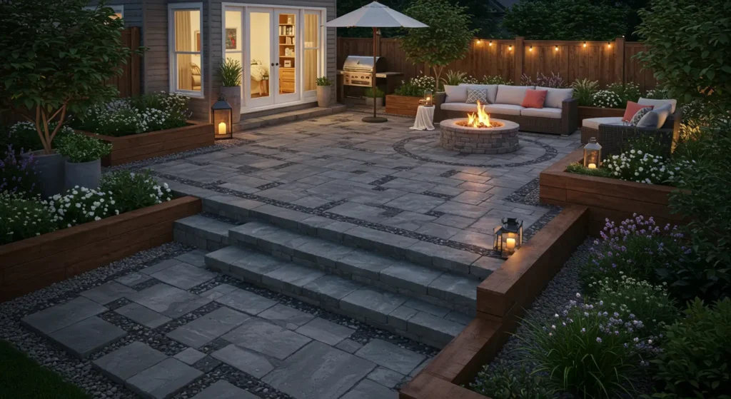 Multi-level layouts define spaces for lounging or dining and work especially well on sloped terrain. Steps, tiers, and built-ins like planters or lights can elevate your patio’s design and usability.