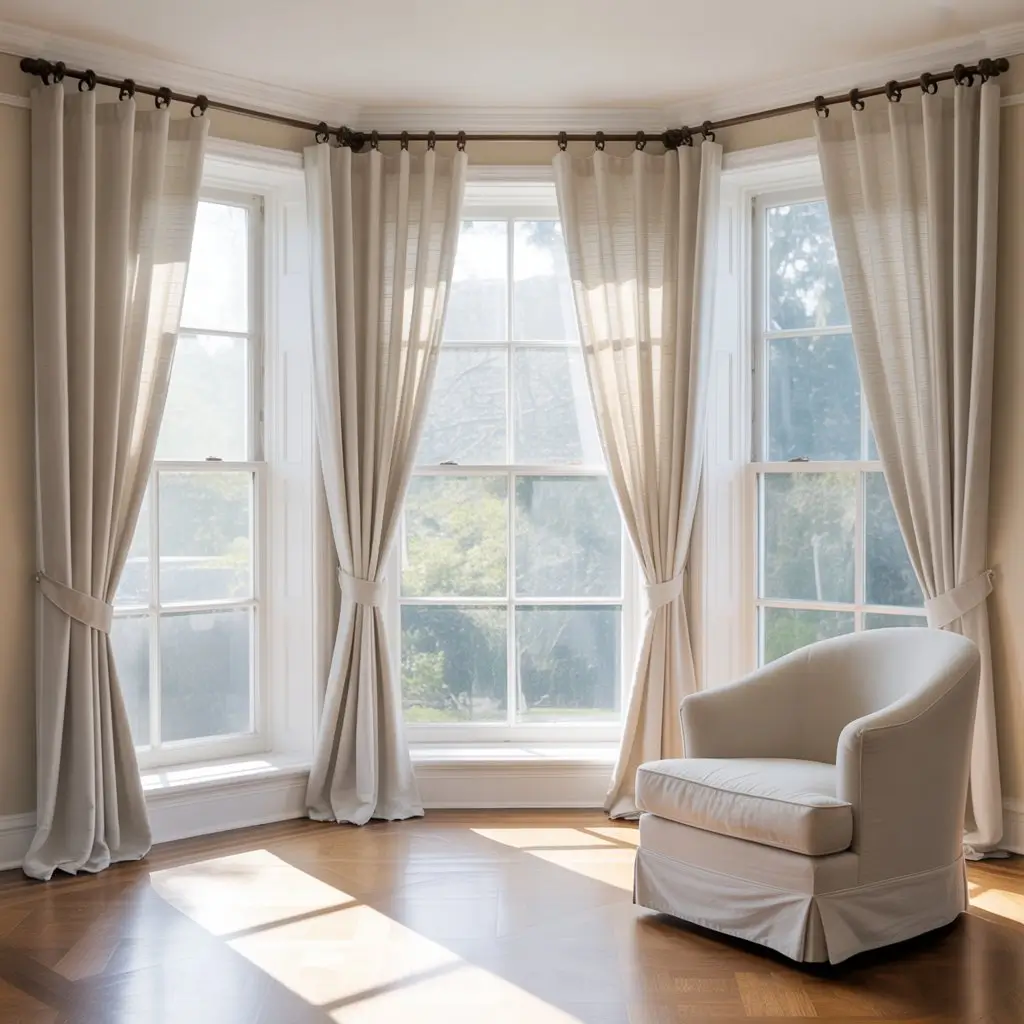 My neighbor has gorgeous bay windows and asked for my help dressing them last year. The trick with bay windows is embracing their shape rather than fighting it. We installed separate curtain rods for each section, creating this soft framing effect that highlights the architecture instead of covering it up. Total cost: about $200 , including rods and panels, which was way less than the $800 quote she got from a professional installer.