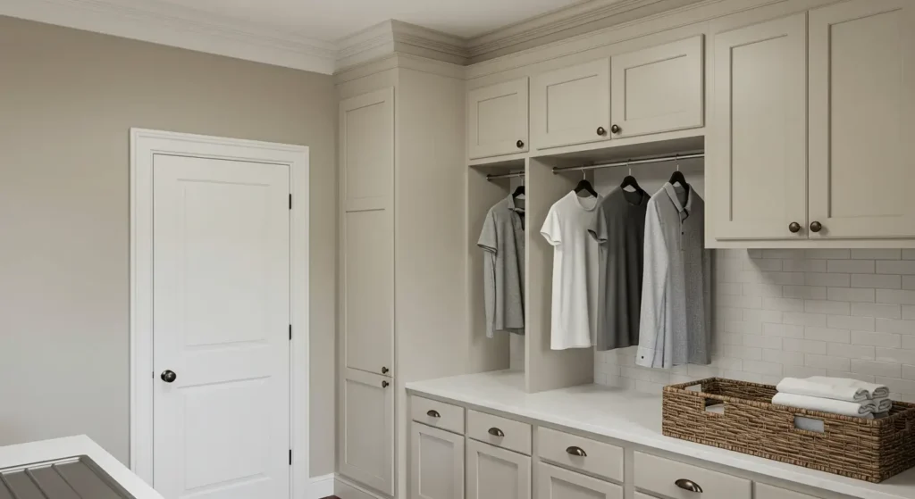 This DIY project works well in bedrooms, laundry rooms, or offices. It adds storage and keeps costs low.