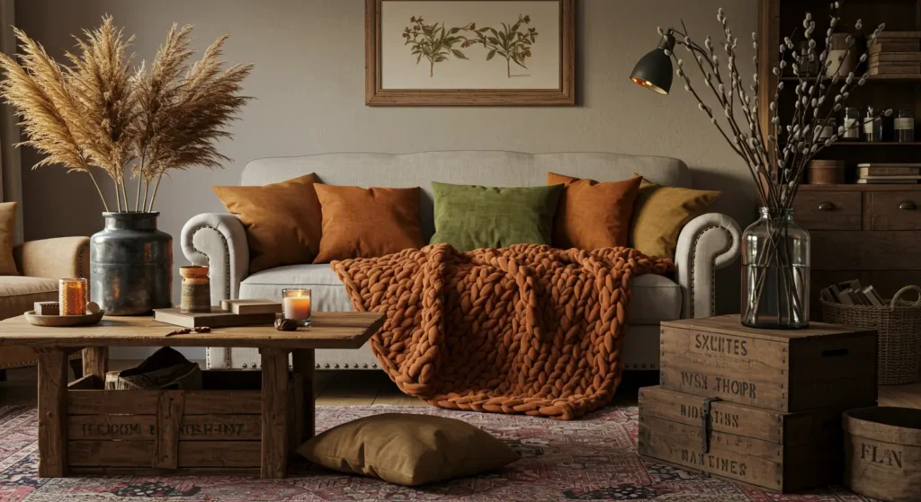 Choose warm colors like oranges, browns, and greens for a cozy feel. Natural elements like dried pampas grass and willow branches add charm. Antique pieces and thrifted finds make your space unique.