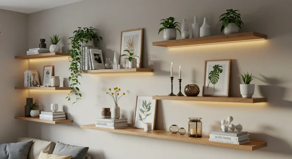 Tip: For a modern touch, add LED strip lights underneath the shelves. They’ll create a warm glow and highlight your displayed items beautifully.