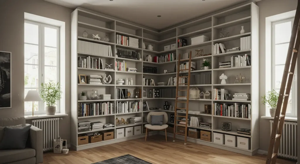 Create a floor-to-ceiling bookshelf wall for a dramatic, library-like feel. This project is perfect for book lovers or anyone looking to add a statement piece to their room.
