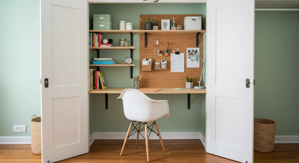 A closet office nook is a clever way to maximize unused space and create a productive work environment. It’s a project that’s both functional and fun to design!