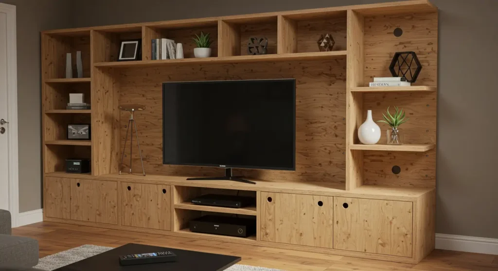 2. Add Shelves and Cabinets: Cut and attach shelves and cabinets to the frame. Include open compartments for electronics and decor, and closed cabinets for hidden storage.