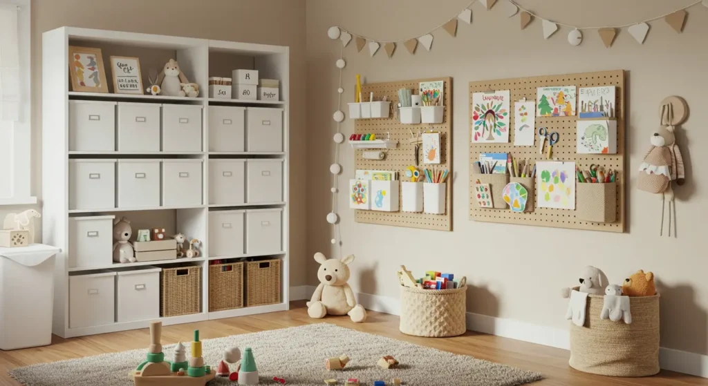 Use vertical space to organize kids’ toys and save floor space. Tall bookshelves store small toys on low shelves and larger toys on top. Wall-mounted organizers like pegboards hold craft supplies and free up room for play. Over-the-door storage keeps small items neat and off the floor. Declutter toys twice a year—before holidays and after the school year.