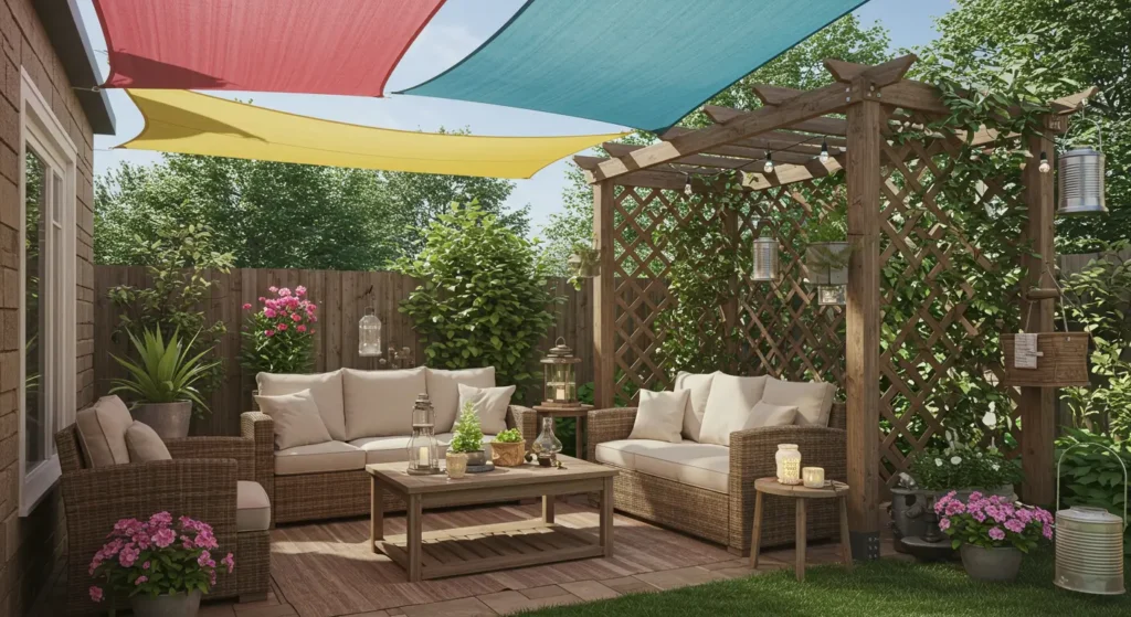 Sail shades, umbrellas, and trellises with climbing plants are budget-friendly and simple to install.