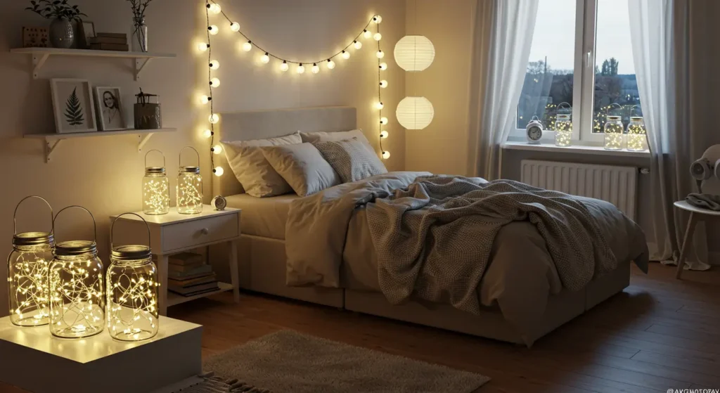 - String Lights Canopy: Hang string lights above your bed or around your windows for a warm glow.
