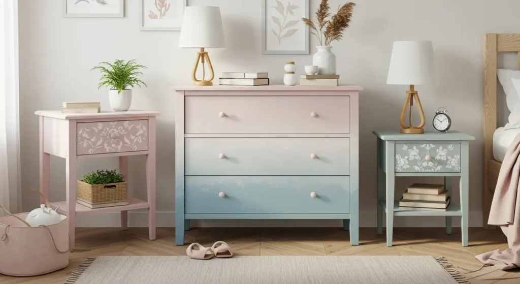 - Stencils and Patterns: Use stencils to create intricate patterns on dressers or tabletops.